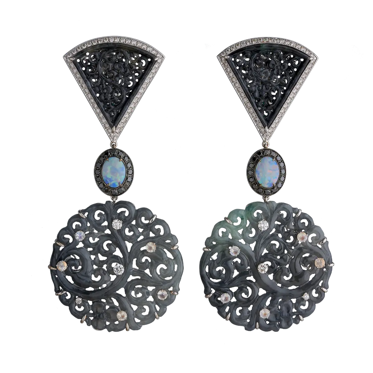 These bold statement earrings juxtapose geometry with tradition. Burmese black and grey Jadeite, carved by master artisans, is set with Australian Opals that flicker with fire. Black Diamonds and moonstones from Madagascar adorn the carvings, while natural Diamonds enhance the luminous play of textures. Crafted in 18K Gold, the design blends sculptural strength with intricate artistry.