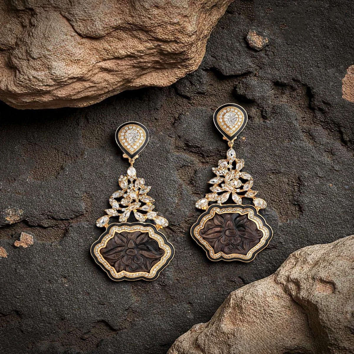 These earrings are a testament to the rarity of golden sapphires. Hand-carved with precision and framed in black enamel, the sapphires take on an architectural elegance. Natural diamonds punctuate the design, adding brilliance that enhances the warmth of the stones. Set in 18K gold, the earrings echo the harmony of tradition and modernity.