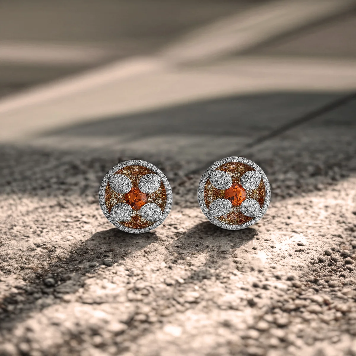 Glowing Nigerian Mandarin Garnets bring a vivid burst of colour alive with fiery orange. Champagne Diamonds shimmer beneath, amplifying the gemstones’ natural sparkle, while white Diamonds above add striking clarity. Set in 18K Gold, these studs capture the raw vitality of fire harnessed into elegant form, making them perfect for both everyday luxury and timeless statement dressing.