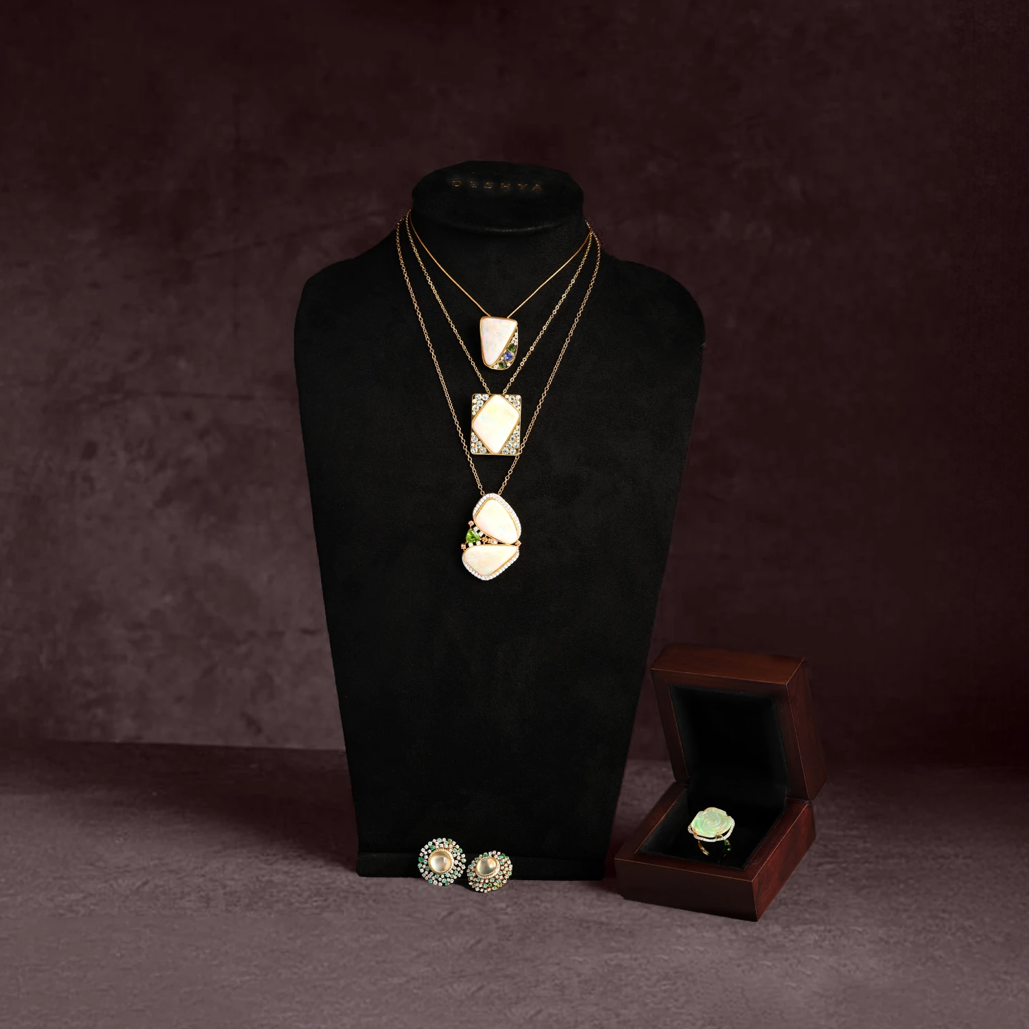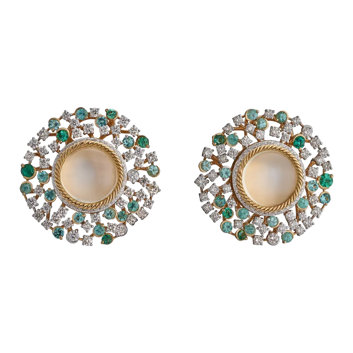 Sri Lankan moonstones take centre stage, their blue-hued adularescence glowing through the surface. Rare Brazilian Paraiba tourmalines heighten the vibrancy, while natural diamonds add brilliance to the composition. Crafted in 18K yellow gold with twisted gold wires, these earrings juxtapose rarity with classic detailing — a luminous play of colour and light.