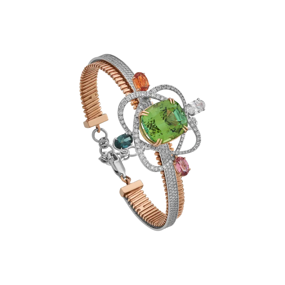 At the core of this cosmic marvel glows a mint tourmaline from Afghanistan, its green spark the star of a created universe. Orbiting it are Sri Lankan sapphires, African tourmalines, and natural diamonds, all meticulously set to mirror a galaxy in motion. The two-toned gold band, finished with micro-pavé diamonds, is a triumph of skill.
