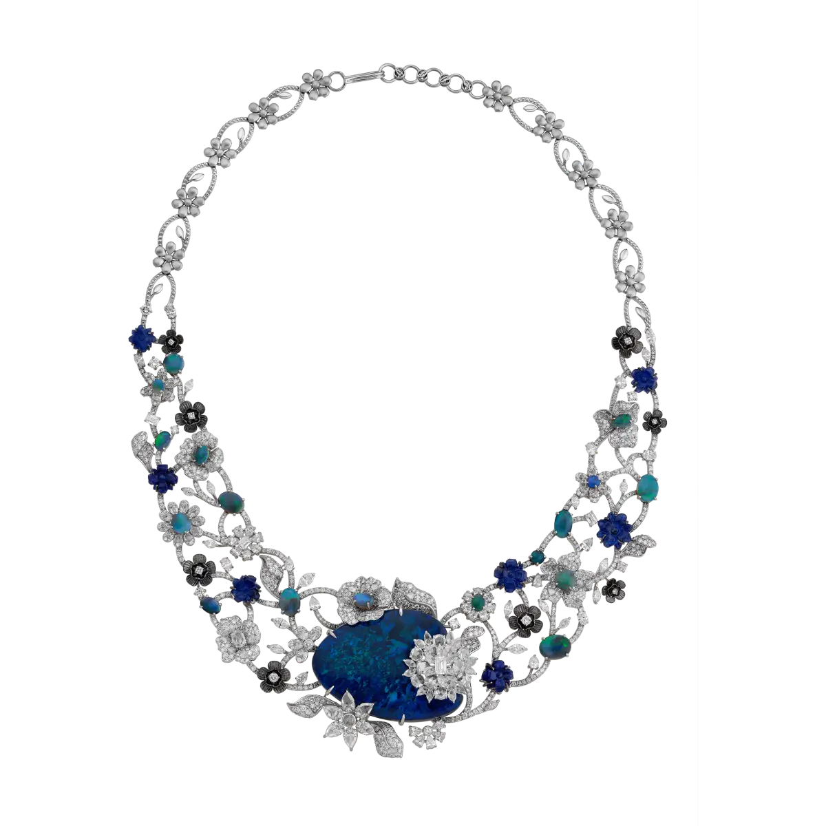 A masterpiece of nature reimagined in jewels — at its centre lies a 63.1-carat Australian Black Opal from Lightning Ridge, alive with a kaleidoscope of shifting colours. Around it, delicate blue flowers carved from Bolivian sodalite bloom, intertwined with opals and natural diamonds in a lattice that moves with remarkable fluidity. Every detail is crafted entirely by hand, a feat of artistry and vision. Singular in its beauty, this necklace is a true one-of-one — impossible to replicate, destined to be treasured for generations.