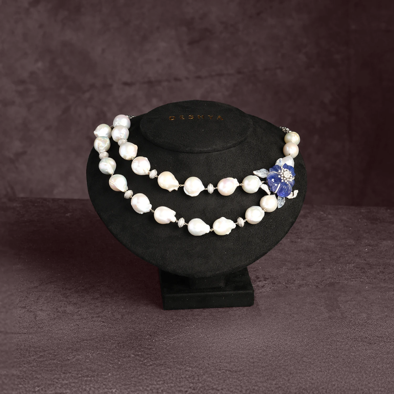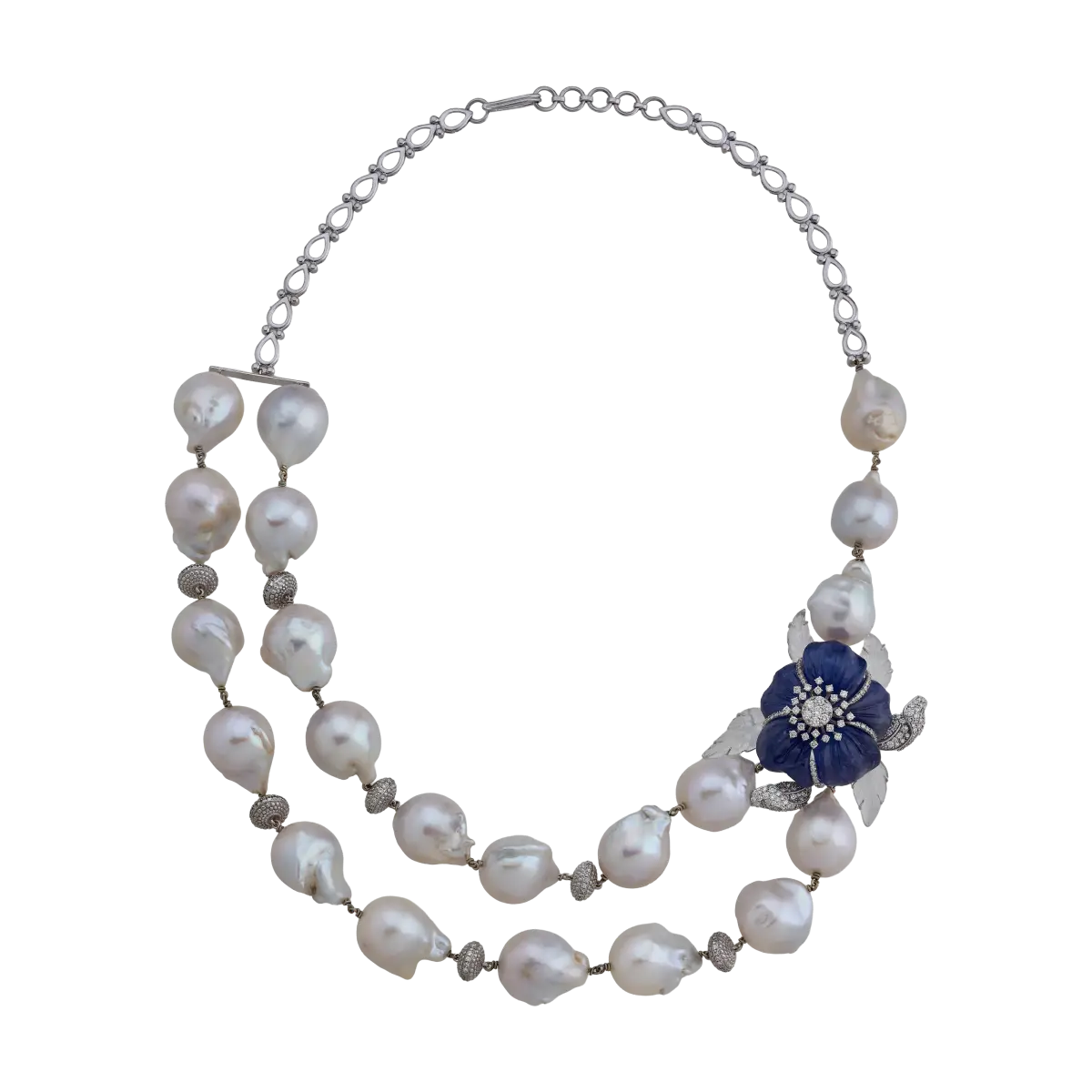 A Victorian-inspired two-line pearl necklace reimagined with modern boldness. At its heart blooms a carved Tanzanite flower, its violet depths heightened by diamond-encrusted leaves and carved moonstones. Two strands of baroque pearls frame the design, each pearl unique, adding individuality and elegance. Gold discs set with diamonds punctuate the rhythm, creating a subtle play of pattern. A jewel that bridges eras — romantic, sculptural, and unapologetically distinctive.