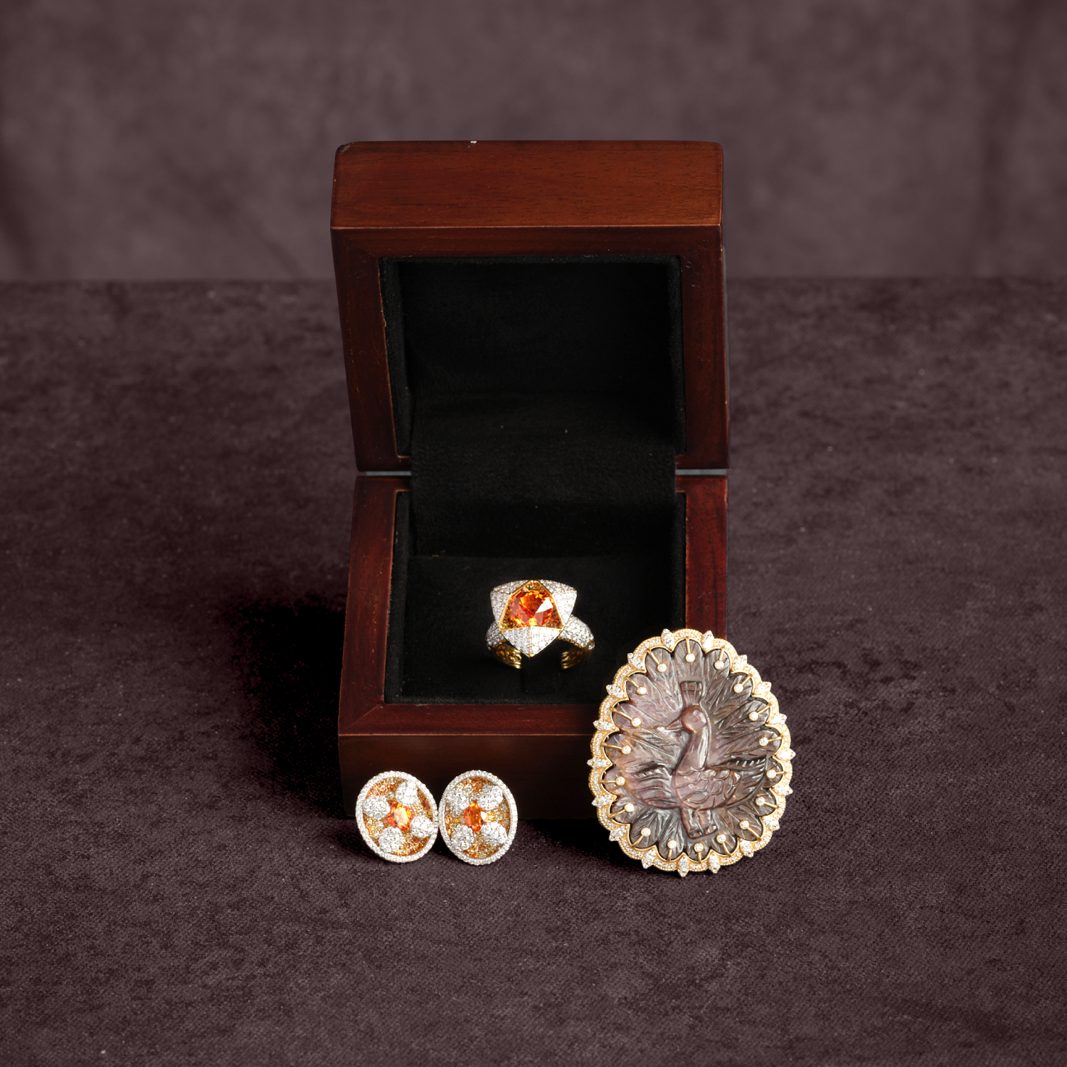 A trillion-cut Mandarin Garnet from Sri Lanka burns with untamed brilliance. Champagne Diamonds shimmer beneath, intensifying the fire of the orange gem, while white diamonds offer a striking contrast. Matte-finished 18K Gold frames the jewel, grounding its vivid energy in a bold, rustic elegance. This ring is a statement of raw colour and refined craft.