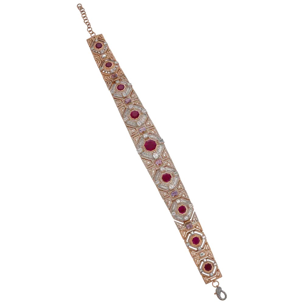 This ruby and spinel set reimagines Art Deco geometry with bold colour and precision. Unheated Octagonal Mozambican rubies, an uncommon cut for this treasured stone, meet lavender-grey Burmese spinels and sculptural emerald-cut diamonds. The choker that transforms into a bracelet, paired with earrings and a jacket ring, creates a set of striking versatility. Each piece commands attention on its own, but together they form a seamless composition — red fire softened by smoky hues and framed in diamond brilliance. A set that celebrates craftsmanship, versatility, and the elegance of design in perfect harmony.
