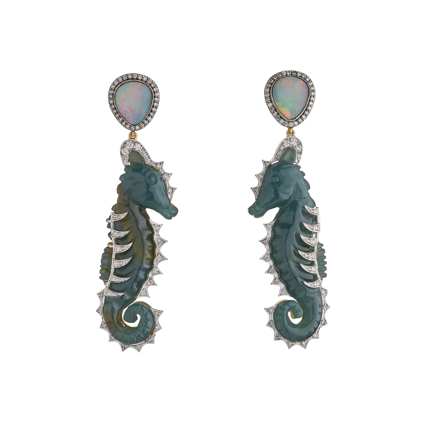 SEAHORSE EARRINGS SET WITH GUATEMALAN BLUE JADE, AUSTRALIAN OPALS AND DIAMONDS