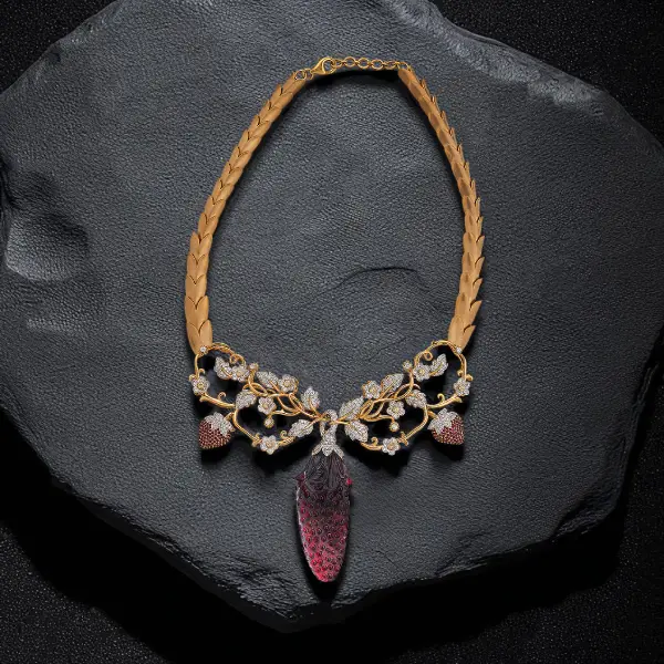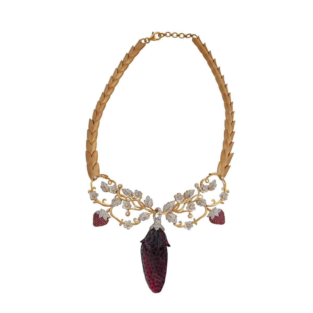 A playful masterpiece, this necklace transforms the joy of a strawberry garden into wearable art. Mozambique red garnet, carved into a luscious strawberry by a master Jaipur artisan, are interspersed with smaller berries adorned with rubies for lifelike detail. Golden flowers sparkle with yellow diamonds at their centers, while leaves in 18K gold complete the design. Every element meticulously crafted to transport you to a garden of abundance, colour, and charm.