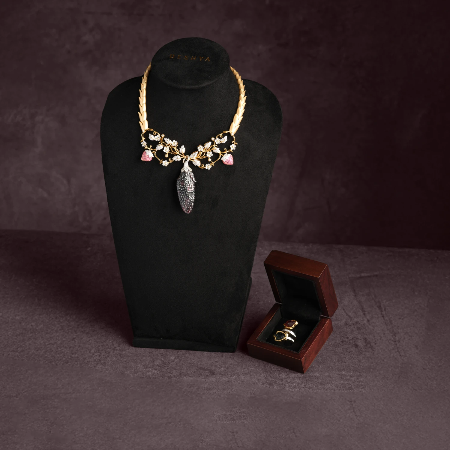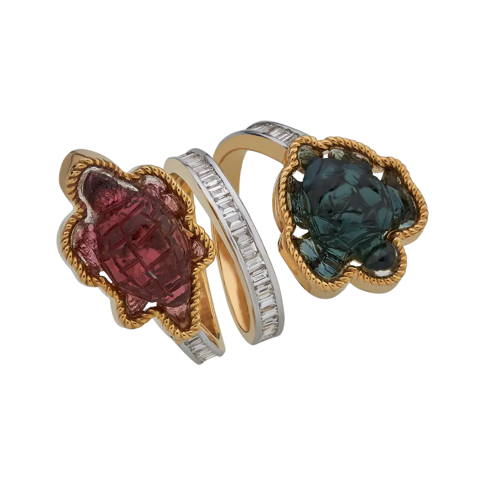 This whimsical ring tells the story of two turtles, each carved from rare tourmalines — a serene blue from Nigeria and a fiery red rubellite from Madagascar. Their paths, lined with sparkling diamond baguettes, meet in a composition full of narrative charm. Set in 18K gold and brought to life by Jaipur’s master carvers, the piece is playful yet deeply refined. A jewel that merges storytelling with artistry, it embodies both whimsy and elegance in equal measure.